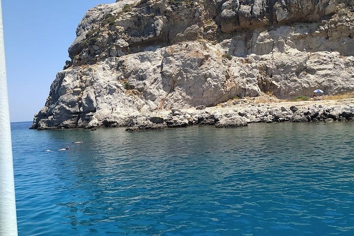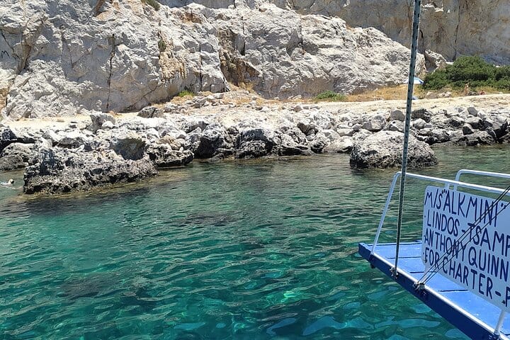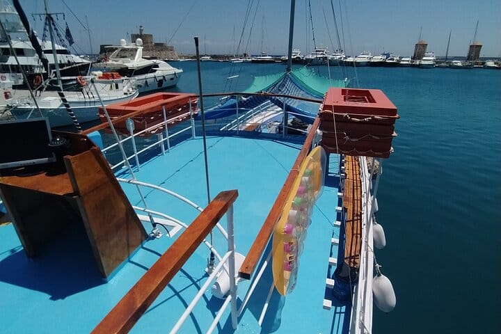 The boat starts in Mandraki harbour and we sail along to the east coast of Rhodes island,we do first stop to Anthony quinn bay for swim and snorkel ,then we go to Afandou for swim snorkelling,relax on board down of the sun or shadow and last stop is Kallithea beach for another swim and snorkelling .